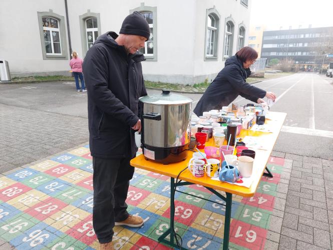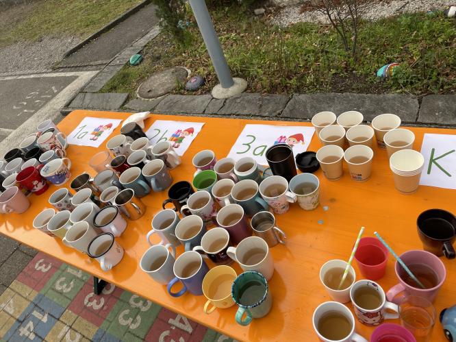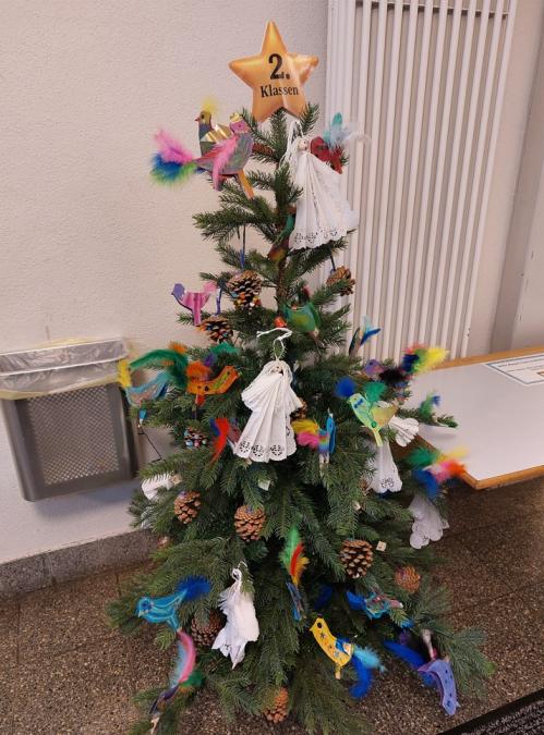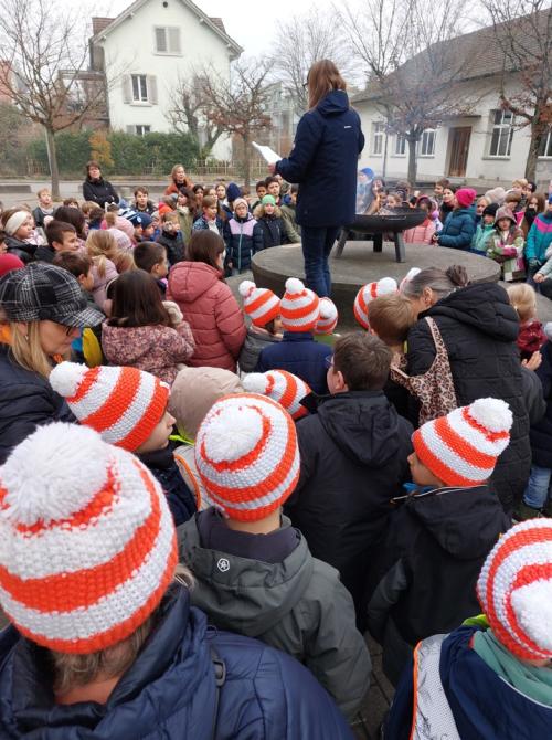 Auf dem Pausenplatz versammelten sich alle um eine Feuerschale. Gemeinsam wurde einer Geschichte gelauscht, gesungen und bei einer Tasse warmem Tee die vorweihnachtliche Stimmung genossen. Die Kinder nahmen sich Zeit, die letzten geöffneten Türchen des liebevoll gestalteten Adventskalenders zu bestaunen oder noch einmal einen Blick auf die hübsch geschmückten Bäumchen - mit den von den Kindern selbstgebastelten Anhängern - zu werfen.